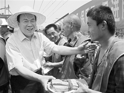 5月16日,太原铁路局工会主席杨志华(左)为农民工送上胶鞋和毛巾。太原铁路局注重改善农民工的生产生活环境,南同蒲工务综合施工开始后,路局采购了夏凉被、胶鞋及毛巾、藿香正气口服液等,现场慰问参加施工的农民工。张培旺 刘晋生 摄