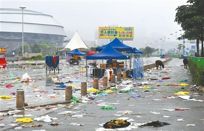 5月20日,福建泉州,海峡体育中心一夜之间变成垃圾场。5月19日晚,2012“诺亚方舟”五月天泉州演唱会在海峡体育中心举行。20日凌晨6点,记者发现观众和商贩丢弃的垃圾一片狼藉,几只黄牛在垃圾中觅食,原本美丽的体育中心仿佛经历了一场空前浩劫。谢明飞 摄