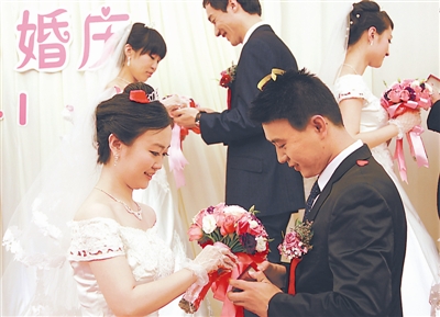 近日,中油阳光物业公司在北京人民大会堂宾馆举办了“劳动最光荣,爱情最甜美,父母最可亲,集体最温暖”青年员工集体婚礼,32对普通劳动者从这里踏入了幸福浪漫的新婚殿堂,公司领导集体担任了这32对新人的主婚人。刘苗 摄