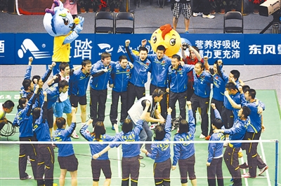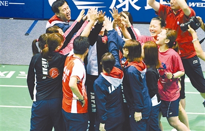 5月23日,2012年汤尤杯羽毛球赛在中国武汉展开1/4决赛的较量。各队上场前运动员都为自己的队伍营造气氛。日本女队也欢呼必胜。本报记者 许之丰 摄