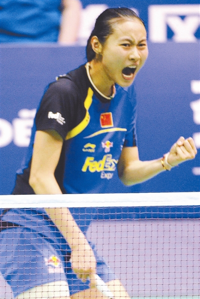 5月23日,2012年汤尤杯羽毛球赛在中国武汉展开1/4决赛的较量,中国女队与德国队争夺一个尤伯杯四强席位。王仪涵2比0击败施纳泽为中国队先下一城。这是王仪涵胜利后的欢呼。