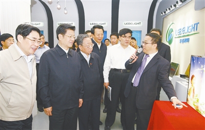 5月17日至23日,中共中央政治局委员、全国人大常委会副委员长、中华全国总工会主席王兆国在河南、山西考察调研。图为王兆国在山西乐百利特科技有限公司考察LED新光源项目。任灵杰 摄