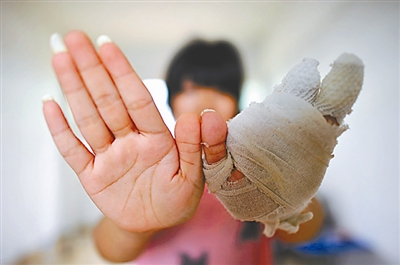 17岁的吴晓珊在展示断了4根手指的左手掌