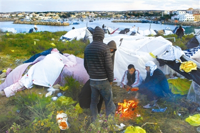 意大利兰佩杜萨岛是非法移民进入意大利等一些欧洲国家的主要“跳板”,岛上的收容所早已满员,非法移民们不得不在海滩或者路边的空地上搭帐篷露营。(资料图,摄于2011年4月)