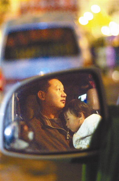 2012年3月,广东湛江,在被当做卧室的面包车里,来自安徽亳州的3岁小女孩雨琦依偎在父亲戴献华怀里,她的父亲戴献华是一名防水工。湛友 摄
