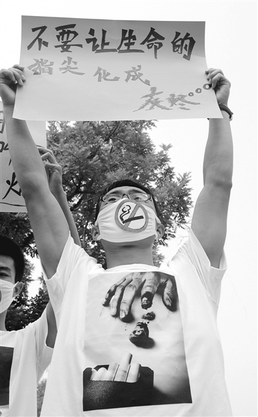 当日,为迎接5月31日“世界无烟日”,聊城大学音乐学院的10名大学生组成“90后戒烟队”,身着印有吸烟危害图片的T恤,戴着粘有禁止吸烟标识的口罩,手举写有劝戒烟语句的自制标牌,在聊城街头向市民宣讲吸烟的危害。新华社发 (董光强 摄)