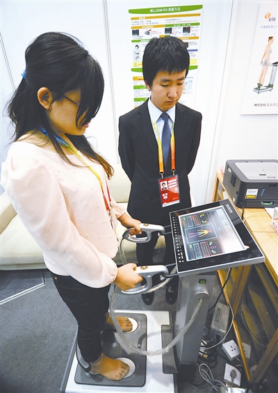 5月29日,观众在京交会主题核心展区内体验代谢综合征检查仪。