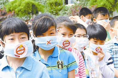 5月31日,山东威海塔山小学的几名“禁烟小卫士”展示他们制作的“抵制吸烟和二手烟”标识的宣传口罩。当日是第25个世界无烟日,孩子们通过制作抵制吸烟和二手烟宣传口罩等劝诫家长和身边的人们远离烟草,争当“禁烟小卫士”。新华社发(于启波 摄)