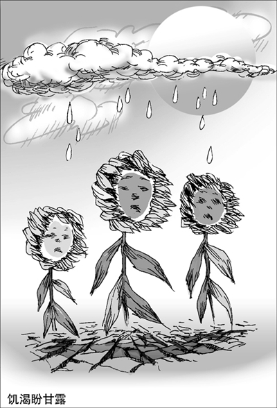 事实上,饿着肚子上学的何止秧木小学的孩子们。中国学生营养与健康促进会前不久发布的报告显示,贫困农村地区的学生普遍营养贫困,近一半的学生不能保证一天吃上三顿饭,多数住校学生自带咸菜、辣椒酱,甚至吃盐拌饭。在一个GDP总量和财政收入双双位居世界第二的国家,竟然有这么多孩子一天吃不上三顿饭,这样的现实不得不让人感到悲哀和羞愧。