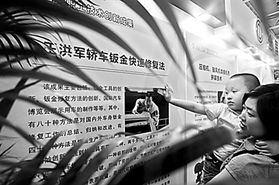 ③:“我长大以后也要当一名科学家。”在全国职工技术创新成果展前,妈妈给他介绍展板上的工人劳模——王洪军。
