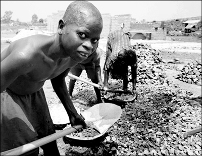 在塞拉利昂首都的一座花岗岩采石场上,几个四五岁的童工正在将坚硬的花岗岩敲击成碎块。他们不但随时面临被采矿炸药炸伤的危险,而且常常要在烈日下曝晒一整天。资料图