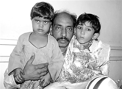 2008年10月31日,在巴基斯坦首都卡拉奇,7岁的新郎穆罕默德·瓦萨姆(右)同他4岁的新娘尼莎(左)以及他的父亲穆罕默德·伊斯米尔坐在一起。资料图