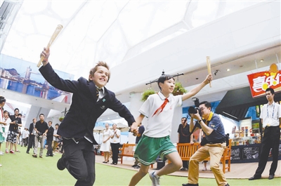 5月31日,北京,中英小学生们进行了模拟伦敦奥运火炬传递活动。近百名来自北京海淀行知实验学校的外来务工人员子女与北京英国学校的英国学生齐聚北京“水立方”,共同参观水立方内搭建的“英伦风情街”、观看北京奥运会闭幕式录像、模拟火炬传递。中外儿童共同感受奥运文化,结下跨国友谊。宏超 摄