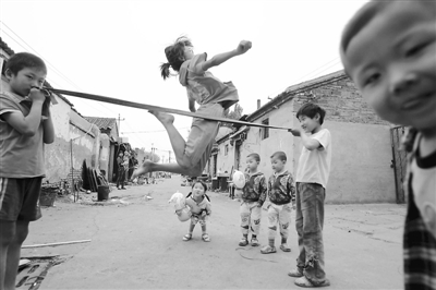 张玉雯(图中),11岁,安徽阜阳人;弟弟(图左)张玉国,10岁。姐弟俩都出生在北京,父亲收废品,母亲做钟点工,平时爷爷奶奶看管他们,他们喜欢北京,“因为风景好,有好多朋友。”张玉雯喜欢跳绳,她说以后想当跳高冠军。