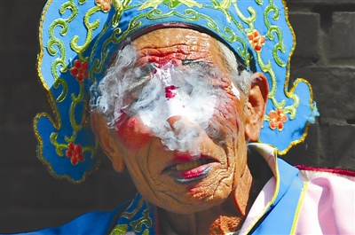 国际博物馆日,山西省太原市举办的民俗活动中,一位民俗演员在后台吸烟休息。 (邓寅明摄于5月18日)