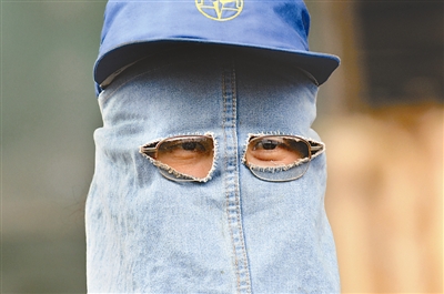 河南省神马集团一矿工地,一位电焊班女工用自制的面罩保护面部。 (本报记者于文国摄于2011年5月22日)