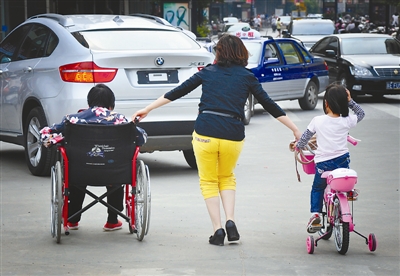 一家三代行走在江苏张家港市交通繁忙的街头,中年女性一手扶住长辈的轮椅,另一边又要照顾骑车小孩的安全。(史志严摄于5月12日)