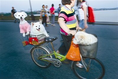 杭州市西湖断桥,一位大姐带着自己收养的狗狗逛西湖。被收养前,三只狗狗分别因身体缺陷被人遗弃街头。 (李建刚摄于5月21日)