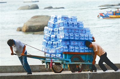 福建省厦门市,几名板车工正在运送矿泉水。每年夏天,他们都会用平板车把岛外运来的矿泉水等物资运上岸。(徐胤摄于2009年10月14日)