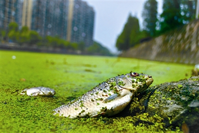浙江温岭市区的高楼倒映在北山河上,浮萍的聚集导致水中缺氧,致使河中的鱼大量死亡。 (金云国摄于5月14日)