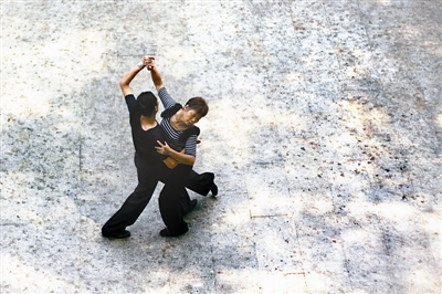 广州,一对老年舞蹈爱好者在越秀山的明城墙下跳舞。(老榆树摄于4月29日)