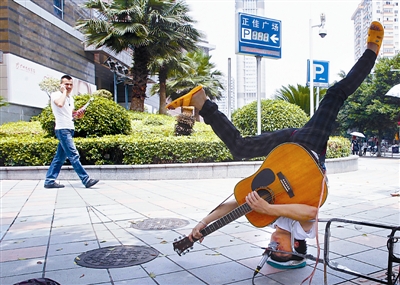 广州正佳广场门前,一个年轻人倒立在人行道上唱歌,路人纷纷称奇。小伙叫玉和情,今年23岁,已在街头倒立唱歌两年。由于每天倒立,头顶的头发都磨没了,他希望有一天能够凭自己的特长出人头地。(何海儿摄于5月20日)