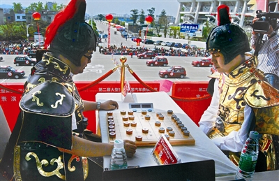 四川成都,第二届大型实景中国汽车象棋大赛上,两位身穿古代戎装的男子在对弈。(成商摄于4月15日)