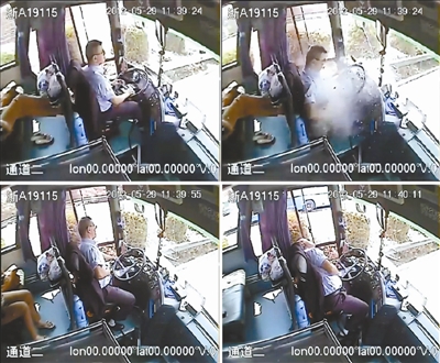 事发客车内监控录像显示:驾驶员吴斌被铁块砸中,忍着剧痛完成一系列完整的安全停车措施后,最终瘫在座位上(视频截图)。 新华社发