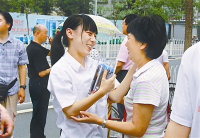 6月7日,北京高考第十四中学考点,入考场前,一名考生在与家长交谈。据统计,2012年全国普通高校招生报名总数为915万人,是2008年达到1040万的最高峰后,连续下降的第四个年头。本报实习生 王叔坤摄
