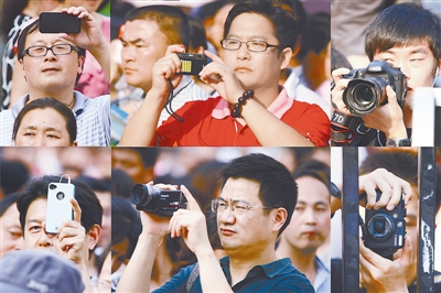 6月8日,家长用各种设备为走出考场的考生拍照留念(拼版照片)。