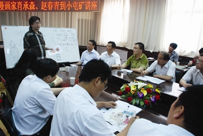 近日,应《牛眼看安全》漫画创作组约请,本报《工人的画》特邀漫画家肖承森走进峰峰集团小屯矿,为那里的职工漫画作者、爱好者上了一节生动有趣的漫画课。