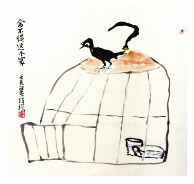 在所有的绘画门类中,漫画应该是最自由的。这不仅表现在技法上,更反映在立意和构思上。在漫画家眼里,鸟是自由的,也是会思考的,它可以思考飞翔在自由的天空,也可以思考寄人笼里,享受“它鸟”得不到的“安逸”。此鸟,何以舍不得离开这个家呢?这当然是权衡各种利弊关系后做出的反应:这个家很温馨,房子不大,却是精装修的。住在这里,有吃、有喝,还有“呵护”;住在这里,省力、省心,还省得“被人惦记”。