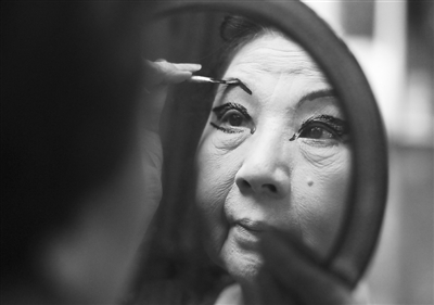 6月3日下午,演员们跟平常一样在认真扮装。68岁的演员李明秀(图①)还在楼梯间的过道里化妆。不同的是,这次李明秀几乎把所有的头饰和装饰品都穿戴上了,闪亮的饰品、鲜艳的油彩妆让她显得更年轻。“这些饰品都是我自己做的,今天演最后一场了,把它们都穿戴上。”李明秀说。