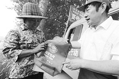 “再给我一个袋子!” 6月4日,安徽淮北供电公司组织员工走进田间地头,向农民发放印有安全用电常识的物品,受到农民欢迎。(李林)