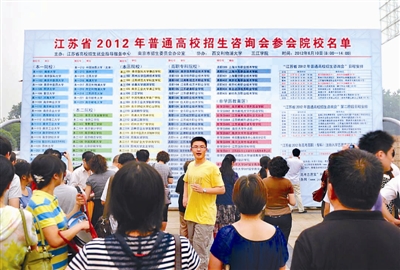 6月10日,考生和家长在观看与会高校名录及展位号。当日江苏省在南京国际展览中心举行2012年普通高校招生咨询会,各地129所本一、本二、本三、高职专科等院校向考生和家长提供招生咨询。考生们顾不上休整,就在家长陪伴下转入择校报名阶段的“战斗”。 新华社记者 孙参 摄