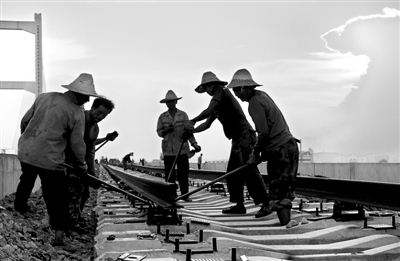 6月9日,中铁二十五局职工正在湘江特大桥上进行铺轨施工。湘桂铁路是国家八纵八横铁路网之一——大(同)湛(江)铁路通道的重要组成部分,是连接我国内陆地区与东南亚地区的重要国际纽带。目前,湘桂铁路扩能改造工程正在紧张建设。整个工程预计在2013年完工。刘爱成 摄