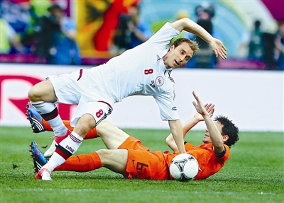 6月9日,荷兰队球员范博梅尔(下)在比赛中防守丹麦队球员埃里克森。当日,在乌克兰哈尔科夫冶金球场进行的2012欧洲足球锦标赛B组首轮比赛中,荷兰队0:1不敌丹麦队。 新华社记者 孟永民 摄