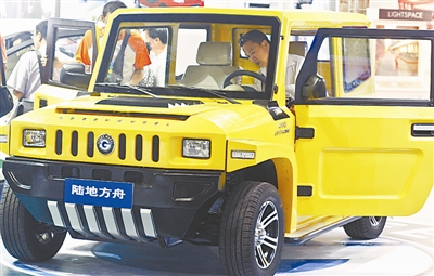 6月11日,观众在北京国际节能环保展览会上试乘一辆黄色越野纯电动汽车。据展方介绍,这辆车快速充电半小时即可上路,平时充电需要5到6个小时。张浩 摄