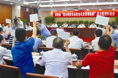 6月13日上午,在浙江省政协举办的“健全食品安全长效管理机制”专项集体民主监督听证会上,22位群众代表争相举牌争取发言。