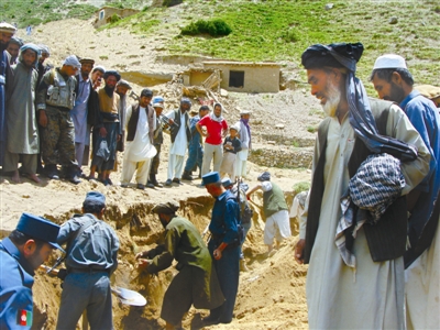 6月12日,在阿富汗北部巴格兰省布尔卡地区,人们搜寻山体滑坡的幸存者。