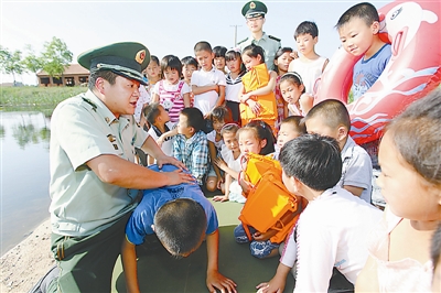 6月12日,针对暑期和汛期安全事故多发问题,山东即墨市公安局岙山边防派出所民警进课堂、下农村,现场给学生们教授溺水自救、落水救助和游泳技巧,确保孩子们暑期和汛期活动安全。(梁孝鹏 张炳舜 摄)