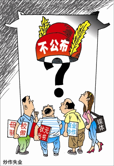 炒作高考状元是一种社会行为,更是特定时段的规定动作,似乎成为后高考时期的“必考题”。媒体热衷“炒”,因为有“看点”,放着现成的新闻热点不做,岂不是在媒体竞争中“甘拜下风”?上有政策,下有对策;学校希望“炒”,因为由此可以“出名”,因高考状元而扬名只是“一小步”,为今后招生领跑才是“一大步”;家长默认“炒”,因为儿女的荣耀就是家庭的荣耀,何况十几年的心血终于有了令人欣慰的回报。