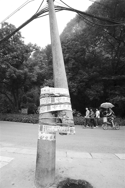 6月13日,广西桂林市穿山公园内一根断裂的电线杆用铁丝和胶布简单地固定着。