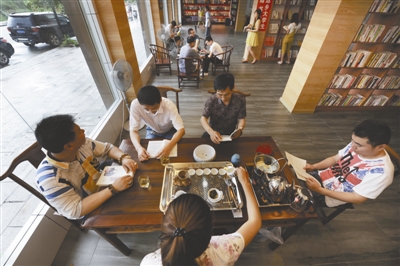 6月9日,在福鼎市一家社区免费图书阅览室里,几位居民一面休闲,一面享受着茶艺师免费的茶艺服务。