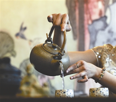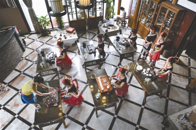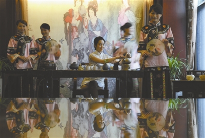 表演中的茶艺师们,对我国古老而富有创新精神的茶俗、茶艺、茶歌、茶诗、茶舞等历史文化有着深层的理解。在此环境中品茶,可在茶香、茶色、茶味、茶韵中启发性情,磨砺心灵。(摄于6月9日晚19时)