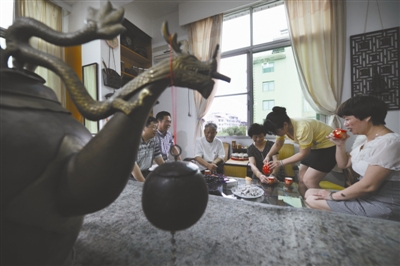 78岁的福鼎市民马树霞,拥有一个三世同堂的幸福之家。他从20年前便开始喜欢收藏与茶文化有关的物件。6月9日下午,儿女们围坐在他的身边品茶,他说,我每天最开心的事就是看着孩子们表演茶艺。