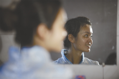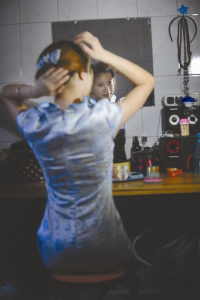 茶艺师江晶晶6个月前被芳名茶业公司录用,6月9日清晨,她在公司提供的单身宿舍里,精心妆扮准备上岗。