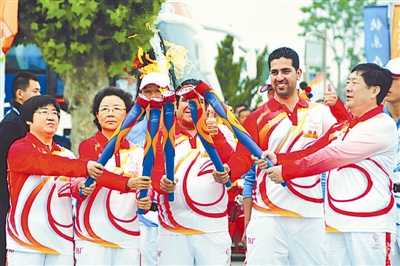 6月14日,火炬手交接点火。新华社记者 邓卫华 摄