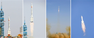 6月16日,神舟九号飞船在酒泉卫星发射中心发射成功(拼版照片)。新华社记者 李刚 摄