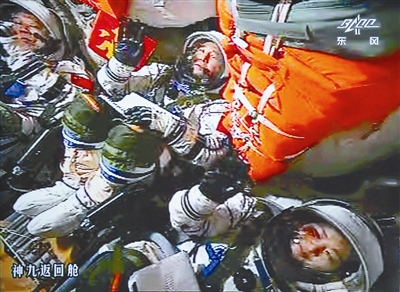 6月16日拍摄的北京航天飞控中心大屏幕显示的神舟九号航天员在返回舱内招手致意的画面。新华社记者 查春明 摄
